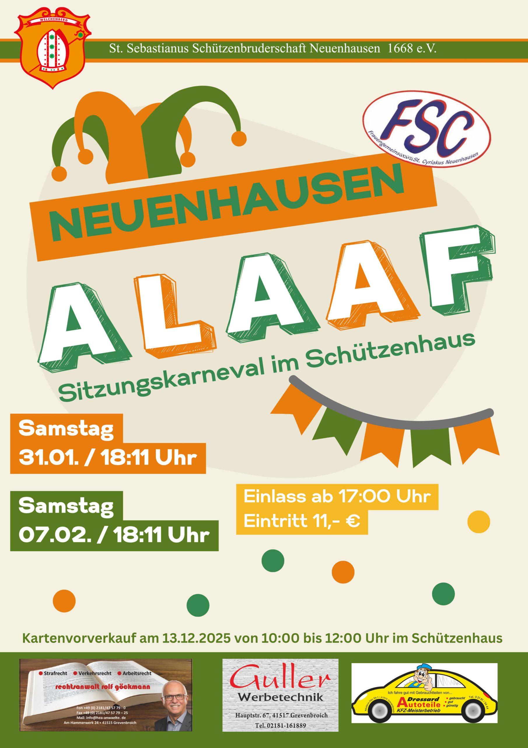 Kartenvorverkauf für die Karnevalssitzungen am 13.12.2025 Der Kartenvorverkauf (11€ pro Karte) für die Karnevalssitzungen findet am 13.12.2025 von 10 – 12 Uhr im Schützenhaus statt.